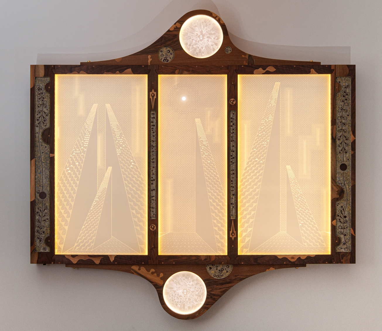 Luminous objects are made of glass, manually incised and backlighted with LED.